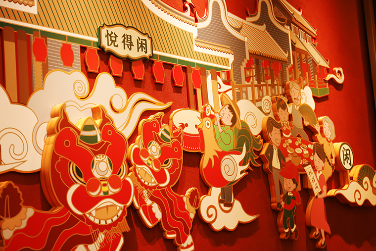 在悅得閑廣式點心茶樓中,品深餐飲設計團隊原創性設計了一組傳統廣州家庭飲早茶的場景,形成品牌輔助圖形,將幸福文化圖像化。并在空間墻面中以亞克力絲印上墻的立體形式展現,效果顯著,趣味性強,引來廣大顧客品味美食之余紛紛拍照分享朋友圈。