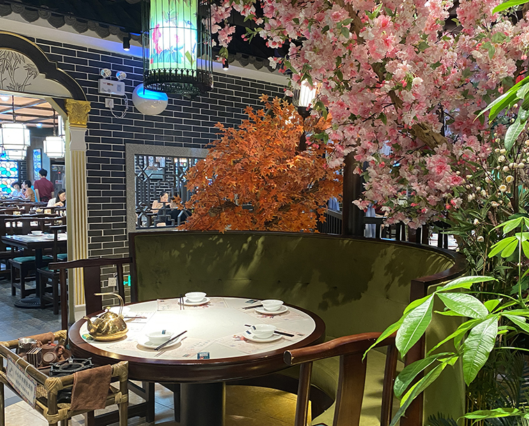 5、花藝綠植。綠化是室內(nèi)設(shè)計(jì)中經(jīng)常采用的裝飾手段,幾乎所有的餐飲空間都有綠化的裝扮。綠化在餐飲空間中的運(yùn)用非常廣泛,不同的餐廳,花藝綠植的應(yīng)用差別很大。一般的餐廳面積有限,綠植和花藝使用較少。主題類(lèi)中餐廳,花園餐廳喜歡使用大量的花藝綠植,為了方便打理,花藝綠植都選用塑料花。品深設(shè)計(jì)策劃設(shè)計(jì)的蘩樓全天茶市,二小姐的店,都使用了不少花藝。其中二小姐的店選用的就是粉紅桃花,營(yíng)造出了小橋流水,江南小鎮(zhèn)的感覺(jué)。