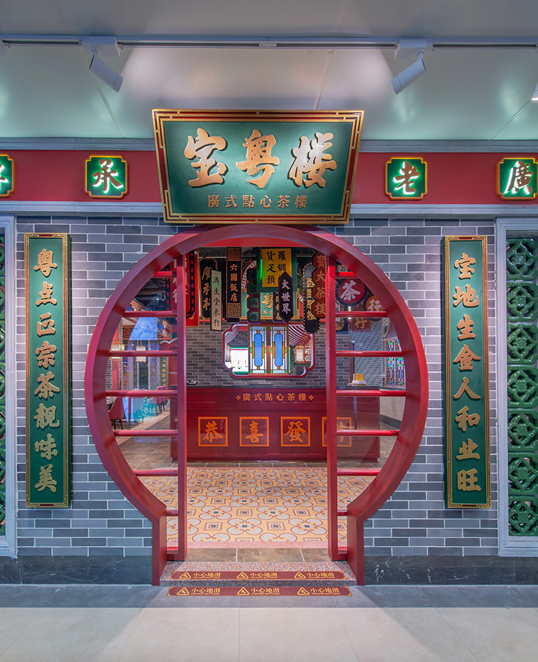 ”這一識(shí)別度高,歷史感強(qiáng),且符合點(diǎn)心茶樓這一品類特性的匾額樣式設(shè)計(jì)變化成寶粵樓的標(biāo)志LOGO圖形。綠色的匾額,金色的字體,用金字招牌的形式把寶粵樓的歷史內(nèi)蘊(yùn)完美表現(xiàn)出來。我們將寶粵樓的主體色定為紅色和綠色。其中紅色使用的面積最大,大量出現(xiàn)在空間裝飾裝修中,綠色則主要出現(xiàn)在各種物料應(yīng)用設(shè)計(jì)中。深綠色在老廣州西關(guān)的古建筑中,出現(xiàn)的頻率很高,是非常具有歷史厚重感的一種色彩。