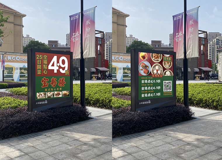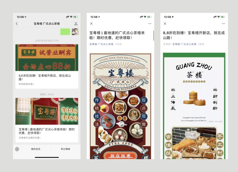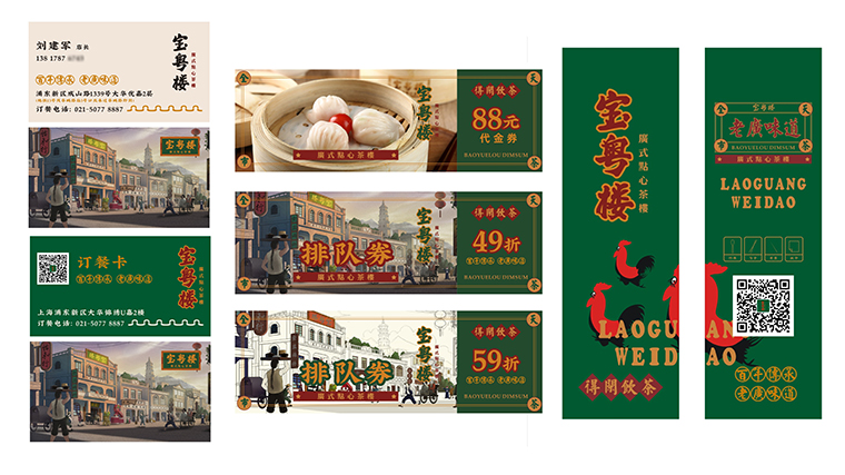 其他的VI如店內(nèi)日常運(yùn)營(yíng)的物料系統(tǒng),導(dǎo)視系統(tǒng),推廣廣告系統(tǒng),品深餐飲設(shè)計(jì)團(tuán)隊(duì)力圖整體空間與品牌完整統(tǒng)一,精細(xì)到連顧客接觸最多的墊餐紙、點(diǎn)餐單、使用的功夫茶具、員工的工衣胸牌、圖片的風(fēng)格,全部統(tǒng)一在寶粵樓的品牌文化體系之內(nèi),給顧客以視覺整齊劃一又靚麗多變的美學(xué)感受。
