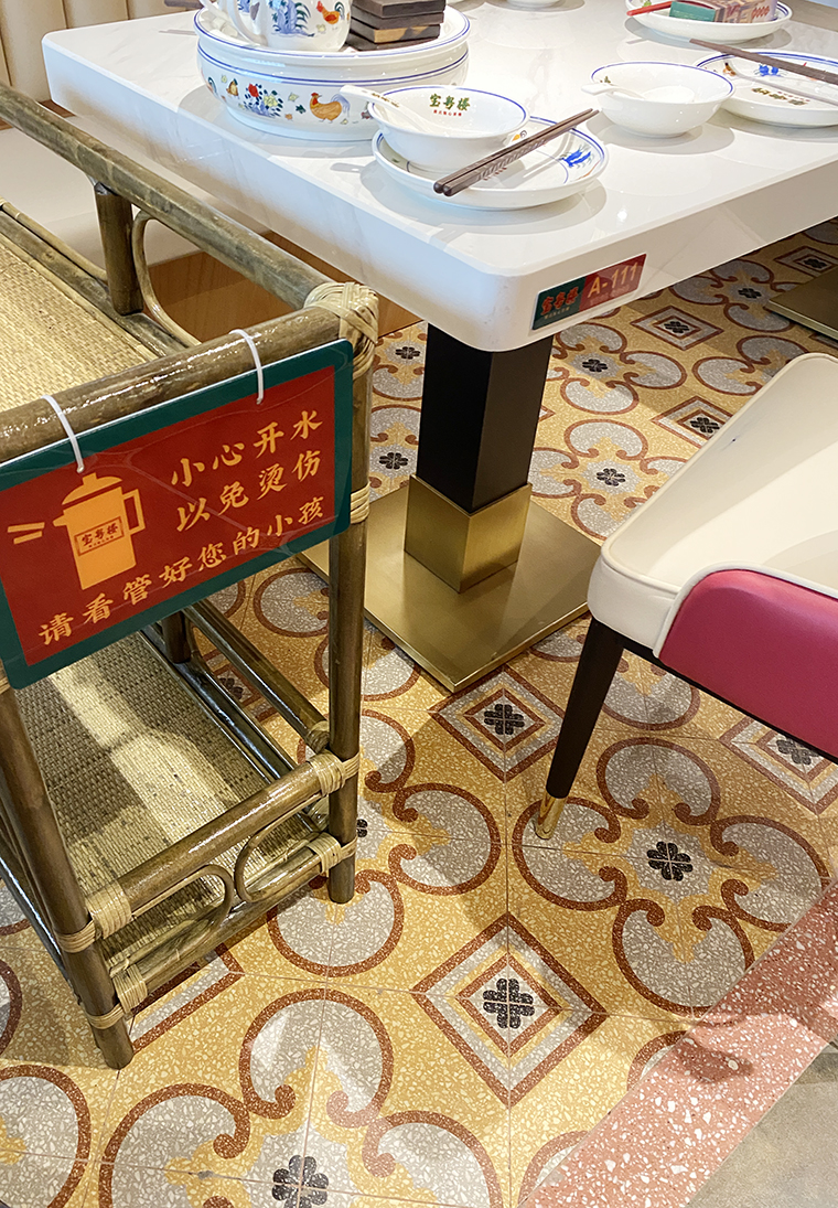 廣式花窗,又稱為滿洲窗。源自于廣州最開始與外國(guó)開展海外貿(mào)易,是典型的舶來品。滿洲窗不同的款式和花紋組合體現(xiàn)了使用者的生活富足與審美情趣。廣式花窗可以很好的表現(xiàn)廣式點(diǎn)心茶樓的品類屬性,具有一目了然,一見如故的特性。在寶粵樓的空間設(shè)計(jì)中,我們將廣式花窗大面積使用門口兩側(cè)的主形象,包房隔斷、甚至天花吊頂上,形成了強(qiáng)烈的視覺沖擊力,具有鮮明的老廣州西關(guān)韻味。