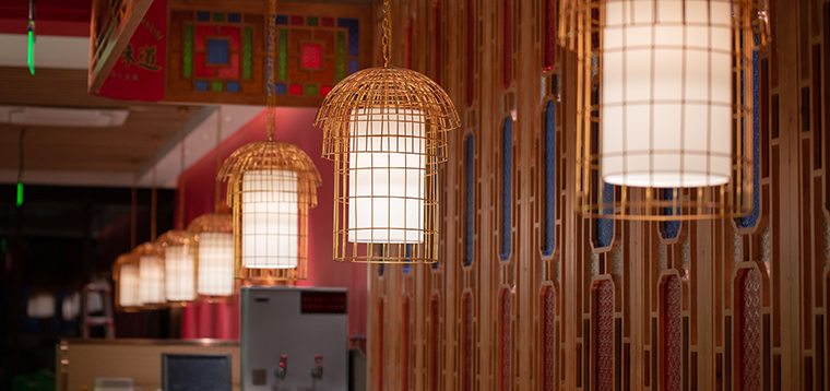 此次寶粵樓的空間軟裝陳列設(shè)計(jì),涵蓋了餐桌餐椅、收銀臺(tái)、服務(wù)臺(tái)、收納柜、沙發(fā)坐具等餐飲家具;空間吊燈及照明裝飾設(shè)計(jì);裝飾品、雕塑擺件、工藝品、畫藝軟裝以及最重要的品牌定制裝置軟裝。家具的主色調(diào)與品牌的主色調(diào)保持一致,椅子的款型也選用了廣州西關(guān)老式茶樓中的椅子;我們所使用的吊燈模仿鳥籠造型就是為了傳遞廣州老茶客提籠遛鳥飲早茶的悠閑幸福生活,和整個(gè)品牌文化高度契合;
