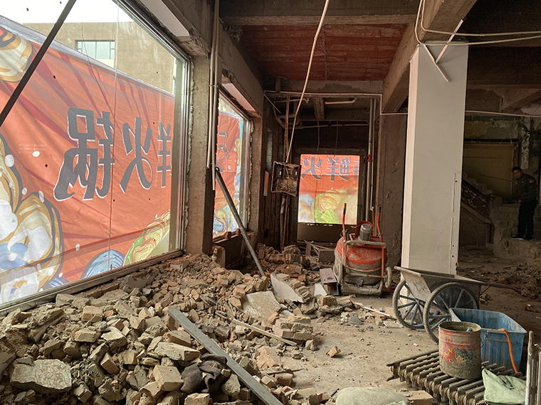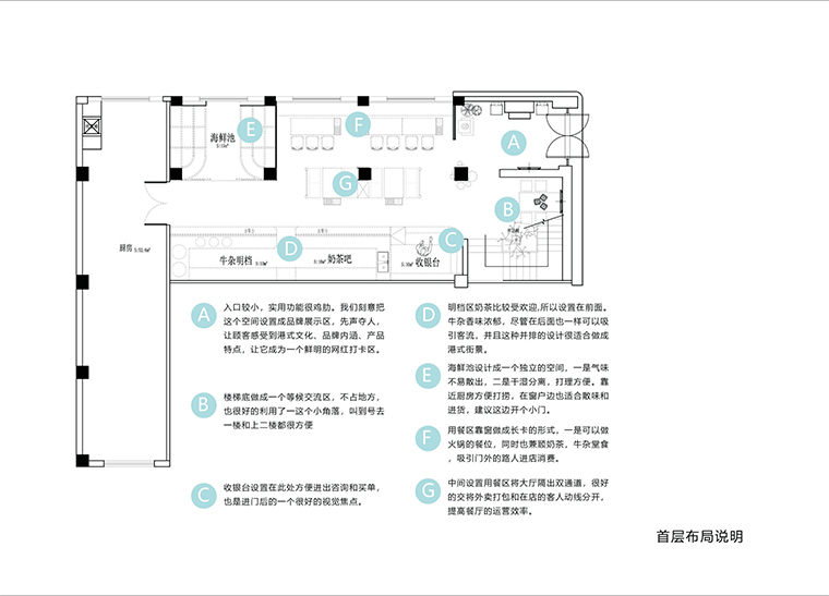 行家花膠雞港式打邊爐餐廳空間,共上下2層,一樓布局上大門入口處,分出牛雜和手作鮮奶售賣窗口,為餐廳引流。
