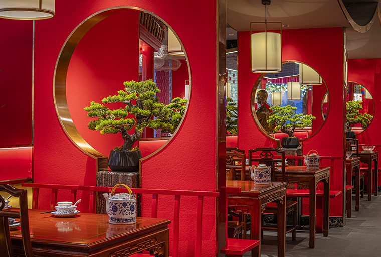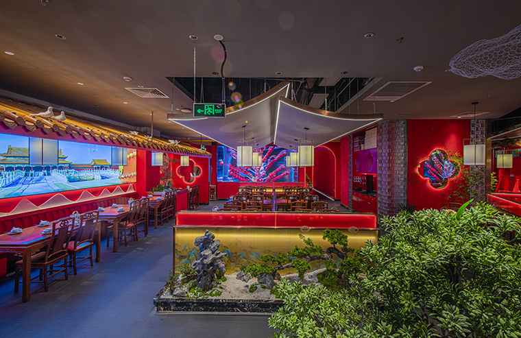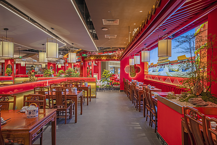 1、本項目為京味張東莞大朗碧桂園里悅里店,總面積約829平方米。用中國紅強化品牌內含的北京皇城文化,令人印象鮮明;