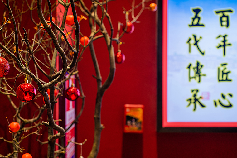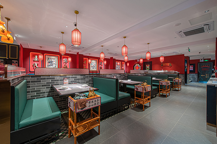 復古紅比鮮紅要暗一些,厚重些,鮮紅是新鮮食材的顏色,表達我們的核心產品賣點,新鮮現做;紅色也是喜慶熱鬧的氛圍表達,可以很好傳達粵點茶樓熱鬧、街坊四鄰飲茶打招呼的場景;